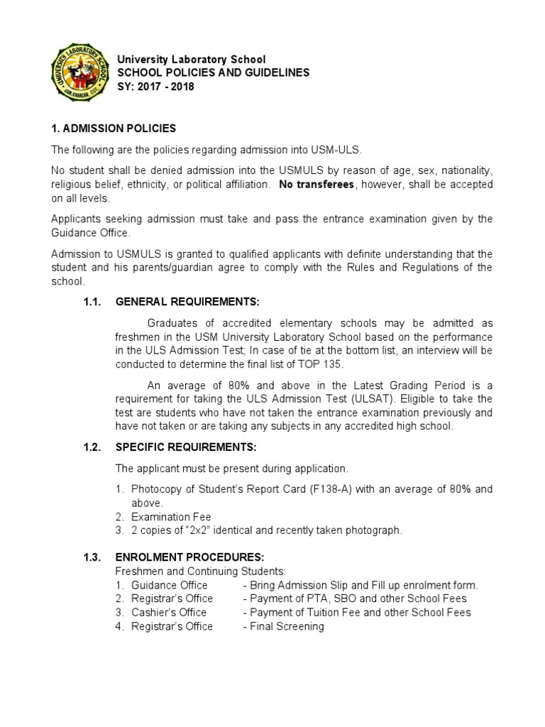 Uls School Policies And Guidelines Pdf University And College Admission Test Assessment